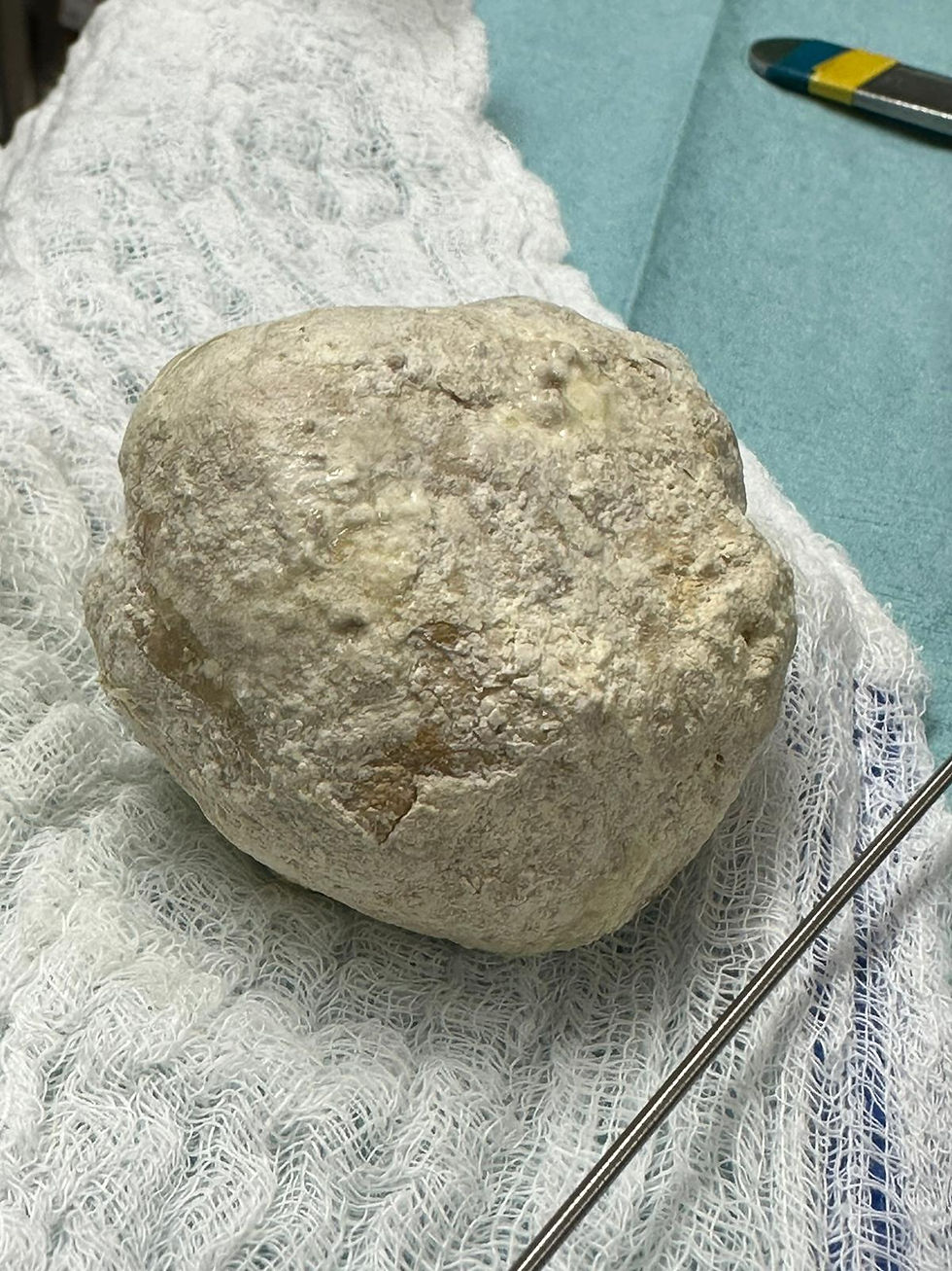 Radiographs (X-rays): The images revealed a massive, multilayered, mineral-dense stone in her bladder.